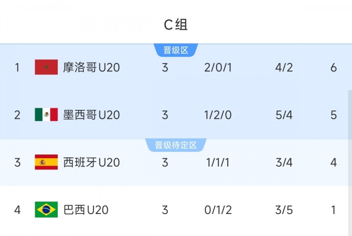 积分榜上,摩洛哥队2胜1负6分头名出线,墨西哥队1胜2平5分第二出线,西班牙队积4分凭借成绩较好的小组第三出线,巴西1分垫底出局。