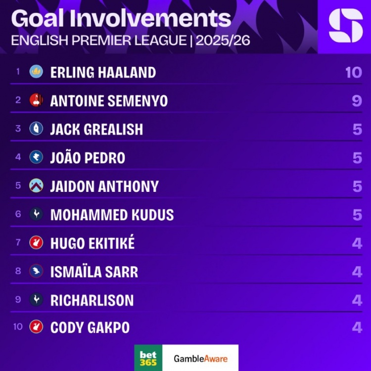 10月6日讯 英超第7轮比赛,曼城以1-0的比分小胜布伦特福德。本场比赛,哈兰德打进全场唯一进球,成为本赛季英超首位直接参与10粒进球的球员。